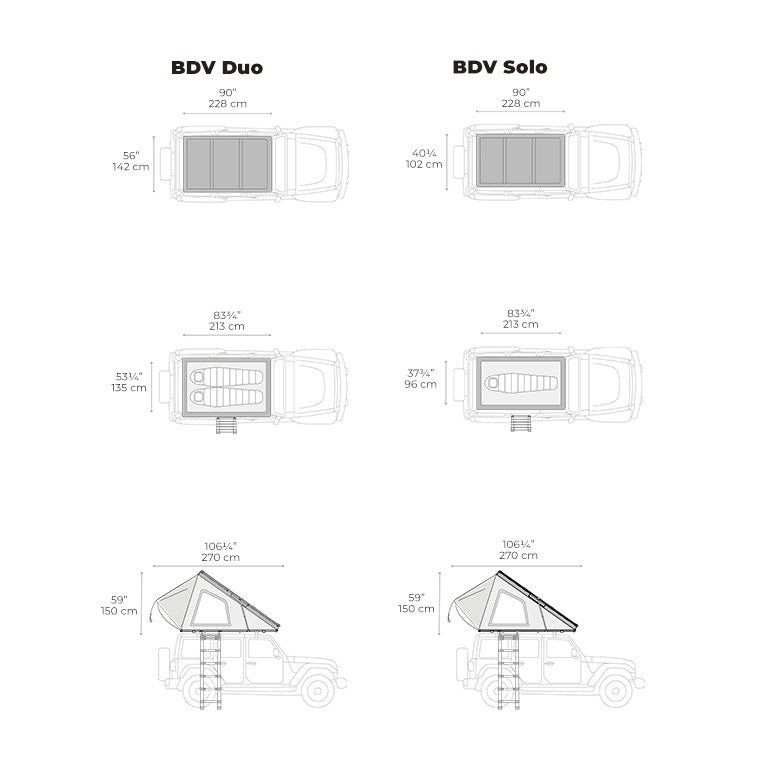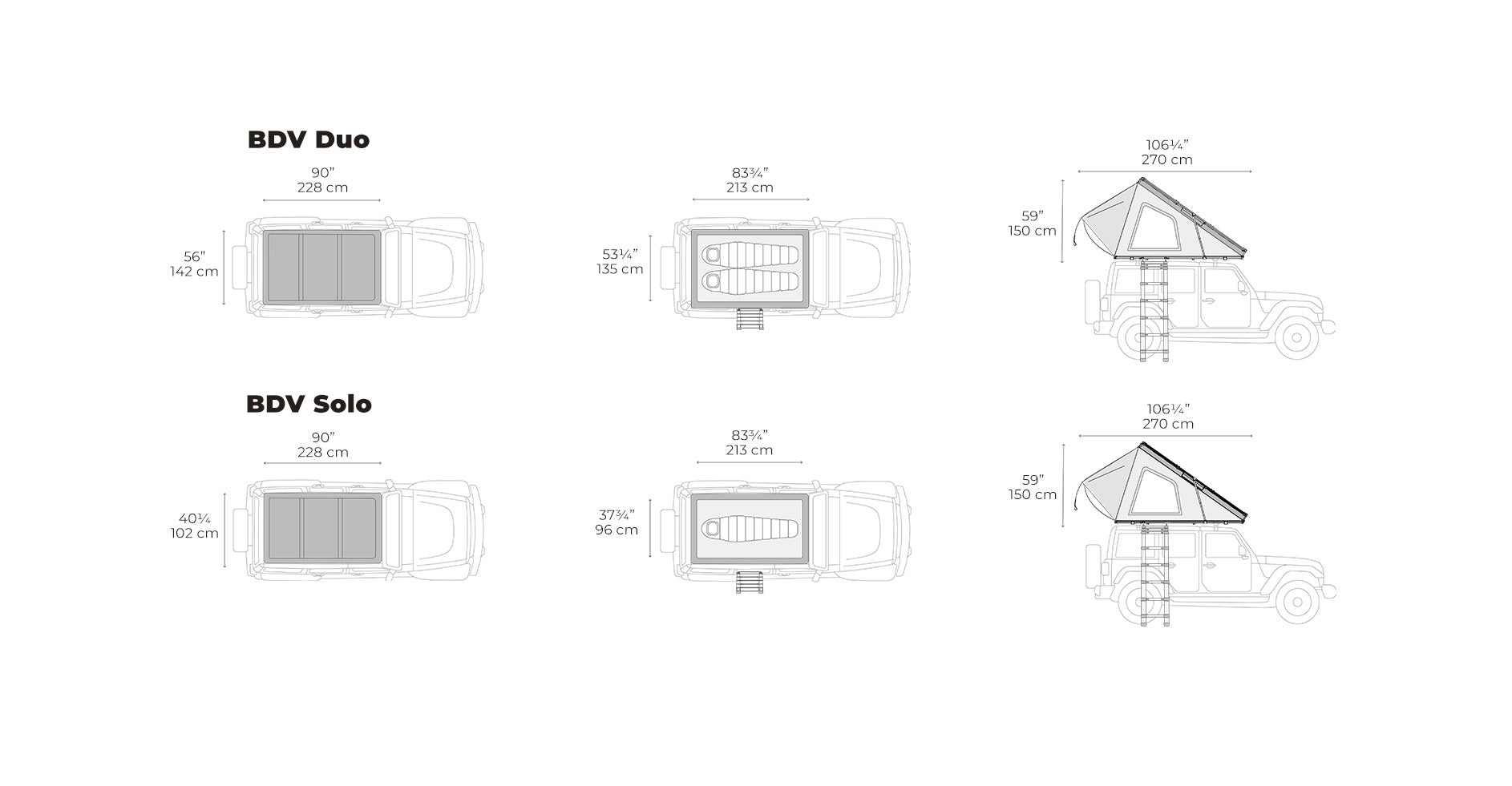 Le BDV Duo, tente de camping-car à toit incliné le plus vendu d'iKamper, offre une installation rapide, des options de montage polyvalentes et une durabilité quatre saisons. Son profil bas de 18 cm maximise l'espace de rangement, tandis que les rails en T enveloppants et les barres transversales supérieures optionnelles facilitent le transport de tout votre équipement. Avec ses multiples points d'accès, ses fenêtres panoramiques et son espace de couchage de 213 x 135 cm (83¾ x 53¾ po), le BDV Duo est votre compagnon d'aventure idéal.